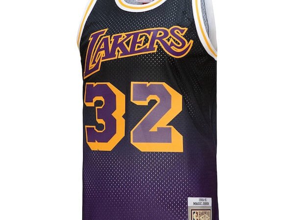 Magic Johnson Los Angeles Lakers 1984/85 Hardwood Classics Fadeaway Swingman Player Jersey – Purple/Black/Gold