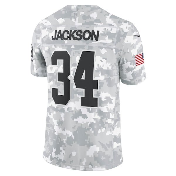 This Bo Jackson 2024 Salute to Service Retired Player Limited Jersey delivers an authentic touch on game day with premium twill team appliques and a tribute to those who serve their country. Its special design is dedicated to the NFL’s charitable initiative and features an allover arctic camo pattern and military-inspired details. Double pique fabric and sweat-wicking Dri-FIT technology provide consistent comfort as you represent a legendary Las Vegas Raiders player and active or retired service members. The NFL does not profit from the sale of Salute to Service products. Charitable contributions are awarded by the NFL Foundation to the NFL’s military partners. For more information, please visit www.NFL.com/Salute.