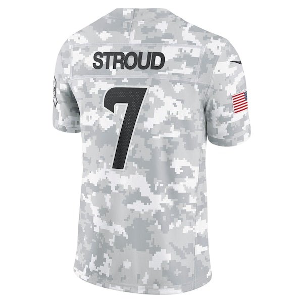 This C.J. Stroud Salute to Service Limited Jersey delivers an authentic touch on game day with premium twill team appliques and a tribute to those who serve their country. Its special design is dedicated to the NFL’s charitable initiative and features an allover arctic camo pattern and military-inspired details. Double pique fabric and sweat-wicking Dri-FIT technology provide consistent comfort as you represent the Houston Texans and active or retired service members. The NFL does not profit from the sale of Salute to Service products. Charitable contributions are awarded by the NFL Foundation to the NFL’s military partners. For more information, please visit www.NFL.com/Salute.