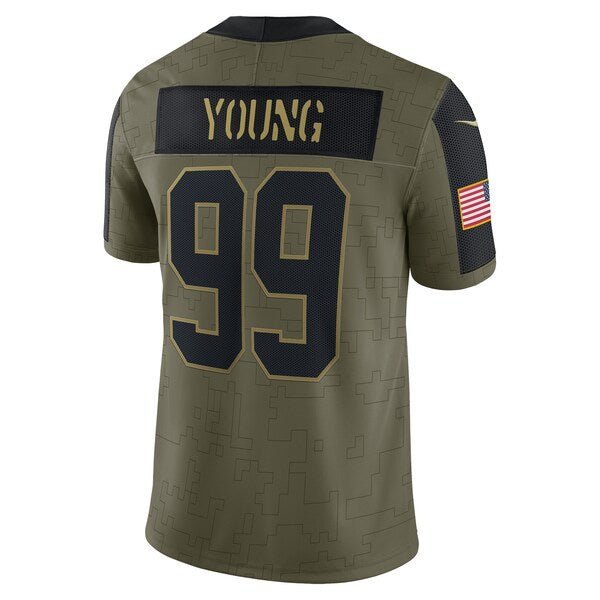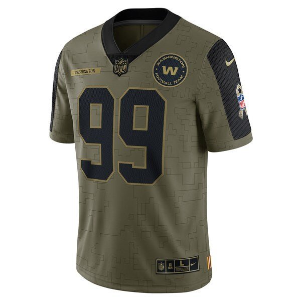 This Chase Young Washington Football Team 2021 Salute To Service Limited Player Jersey from Nike is a spirited piece to have in your collection. It features crisp Washington Football Team graphics, a linear camo-like pattern, an American flag patch on one sleeve, and a camouflage ribbon patch on the other. The VaporKnit technology is a breathable, flexible fabric with moisture-wicking properties to keep you comfortable while cheering the Washington Football Team to victory. The NFL does not profit from the sale of Salute to Service products. Charitable contributions are awarded by the NFL Foundation to the NFL’s military nonprofit partners. For more information, please visit www.NFL.com/causes/salute.