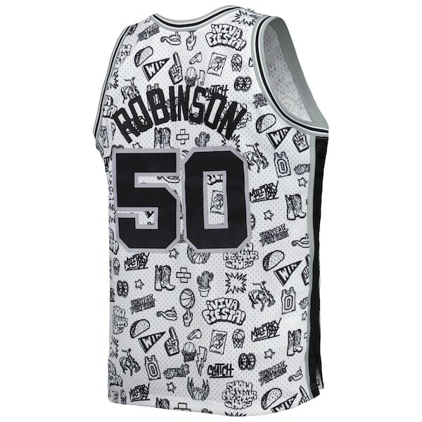 Stand out from the crowd at the next San Antonio Spurs game or watch party by grabbing this 1998/99 David Robinson Hardwood Classics Doodle Swingman jersey by M & N. This jersey highlights one of your all-time favorite players throughout the storied history of your favorite franchise. Complete with tackle-twill San Antonio Spurs graphics, this stylish jersey shows that you’re more than just a casual fan.