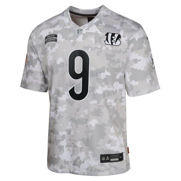 Featuring a tribute to those who serve their country, this Joe Burrow Salute to Service Game Jersey lets young fans represent one of the top stars for the Cincinnati Bengals. Its special design is dedicated to the NFL’s charitable initiative and features an allover arctic camo pattern and military-inspired details. Proper ventilation and a loose fit provide a dry, comfortable wear with an authentic team look supporting active or retired service members. The NFL does not profit from the sale of Salute to Service products. Charitable contributions are awarded by the NFL Foundation to the NFL’s charitable partners. For more information, please visit www.NFL.com/Salute.