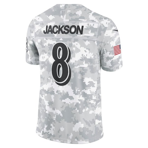 This Lamar Jackson Salute to Service Limited Jersey delivers an authentic touch on game day with premium twill team appliques and a tribute to those who serve their country. Its special design is dedicated to the NFL’s charitable initiative and features an allover arctic camo pattern and military-inspired details. Double pique fabric and sweat-wicking Dri-FIT technology provide consistent comfort as you represent the Baltimore Ravens and active or retired service members. The NFL does not profit from the sale of Salute to Service products. Charitable contributions are awarded by the NFL Foundation to the NFL’s charitable partners. For more information, please visit www.NFL.com/Salute.
