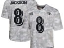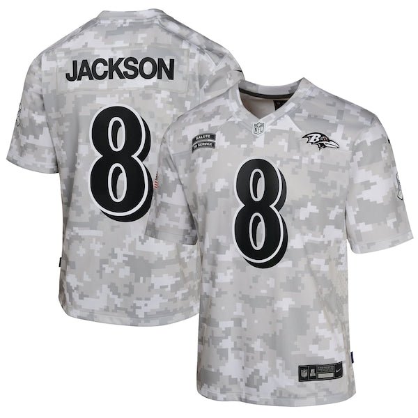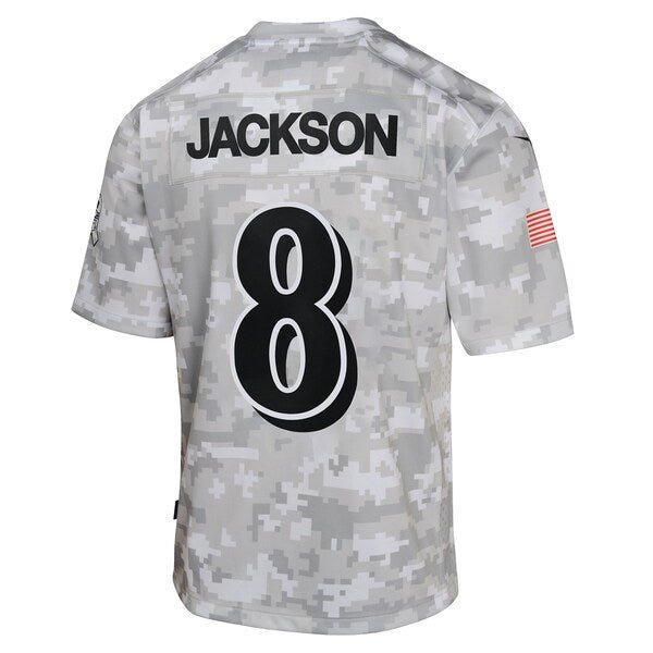 Featuring a tribute to those who serve their country, this Lamar Jackson Salute to Service Game Jersey lets young fans represent one of the top stars for the Baltimore Ravens. Its special design is dedicated to the NFL’s charitable initiative and features an allover arctic camo pattern and military-inspired details. Proper ventilation and a loose fit provide a dry, comfortable wear with an authentic team look supporting active or retired service members. The NFL does not profit from the sale of Salute to Service products. Charitable contributions are awarded by the NFL Foundation to the NFL’s military partners. For more information, please visit www.NFL.com/Salute.