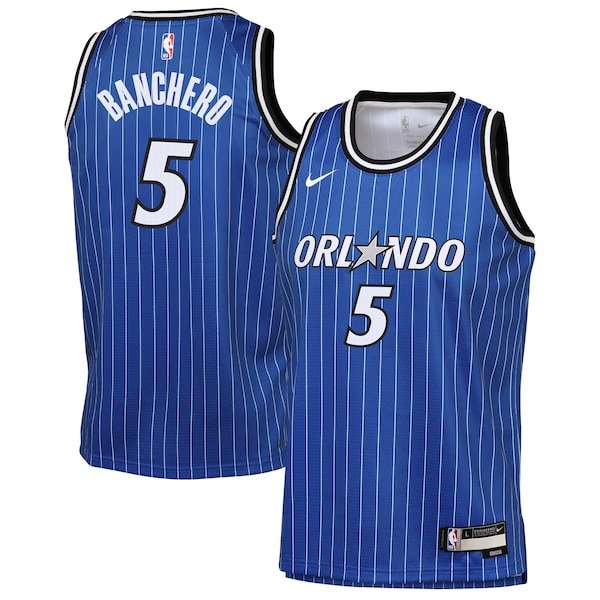 Watch your young fan get ready for tipoff while they rep their favorite player in this Nike Icon Edition Swingman Jersey, featuring Paolo Banchero of the Orlando Magic. The jersey’s double-knit fabric and Dri-FIT technology work together to wick away moisture, keeping them comfortable both on and off the court. The standard, relaxed fit provides an easy feel for all-day wear while the droptail hem with slide splits is engineered for enhanced freedom of movement. Complete with heat-sealed team and player graphics, this jersey is the perfect way for your young fan to support their favorite star.