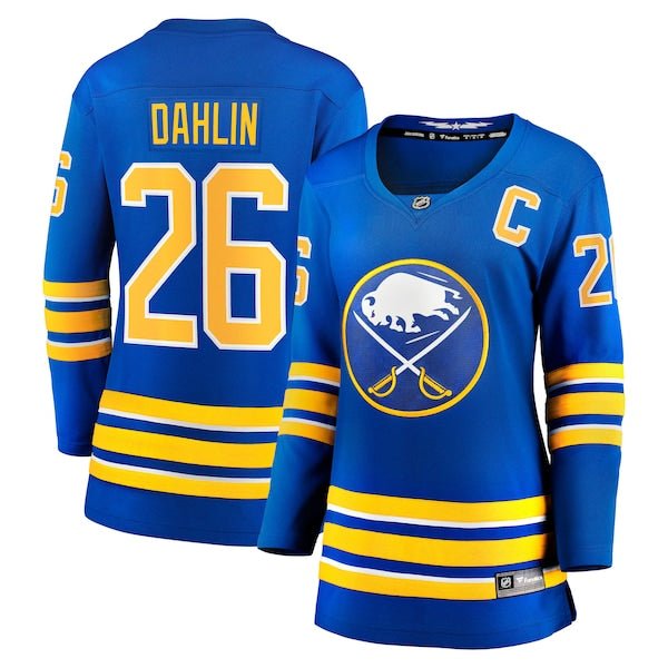 Show your team spirit in style with this Rasmus Dahlin Buffalo Sabres Home Captain Patch Breakaway Jersey from Fantics. Designed with a classic fit tailored for women, this jersey offers improved comfort around the torso and arms for an enhanced wearing experience. The soft, double-knit fabric delivers a midweight feel, ensuring you stay comfortable while cheering on the Buffalo Sabres.
